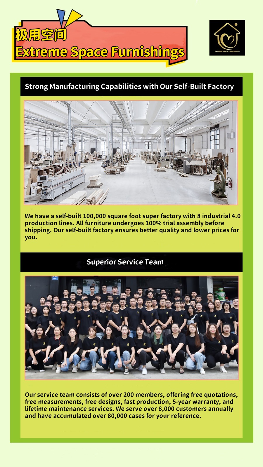 We provide a full range of services, including furniture customization, design, measurement, transportation, and installation with no hidden fees. All pricing is transparent and upfront, so you don’t pay a cent more than necessary. All furniture comes with a 5-year warranty, and we take full responsibility for any quality issues.